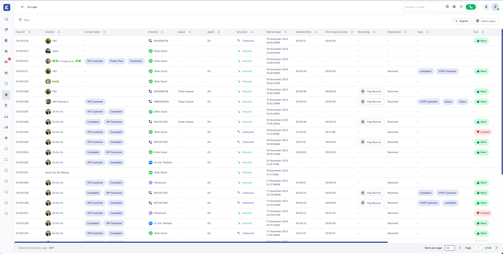 ทุกกิจกรรมการติดต่อกับลูกค้าทุกช่องทางระหว่างเอเจนต์และลูกค้าจะถูกบันทึกเป็นเคส ทุกเคสเหล่านี้จะแสดงในตารางบันทึกการติดต่อ CX Interaction Log