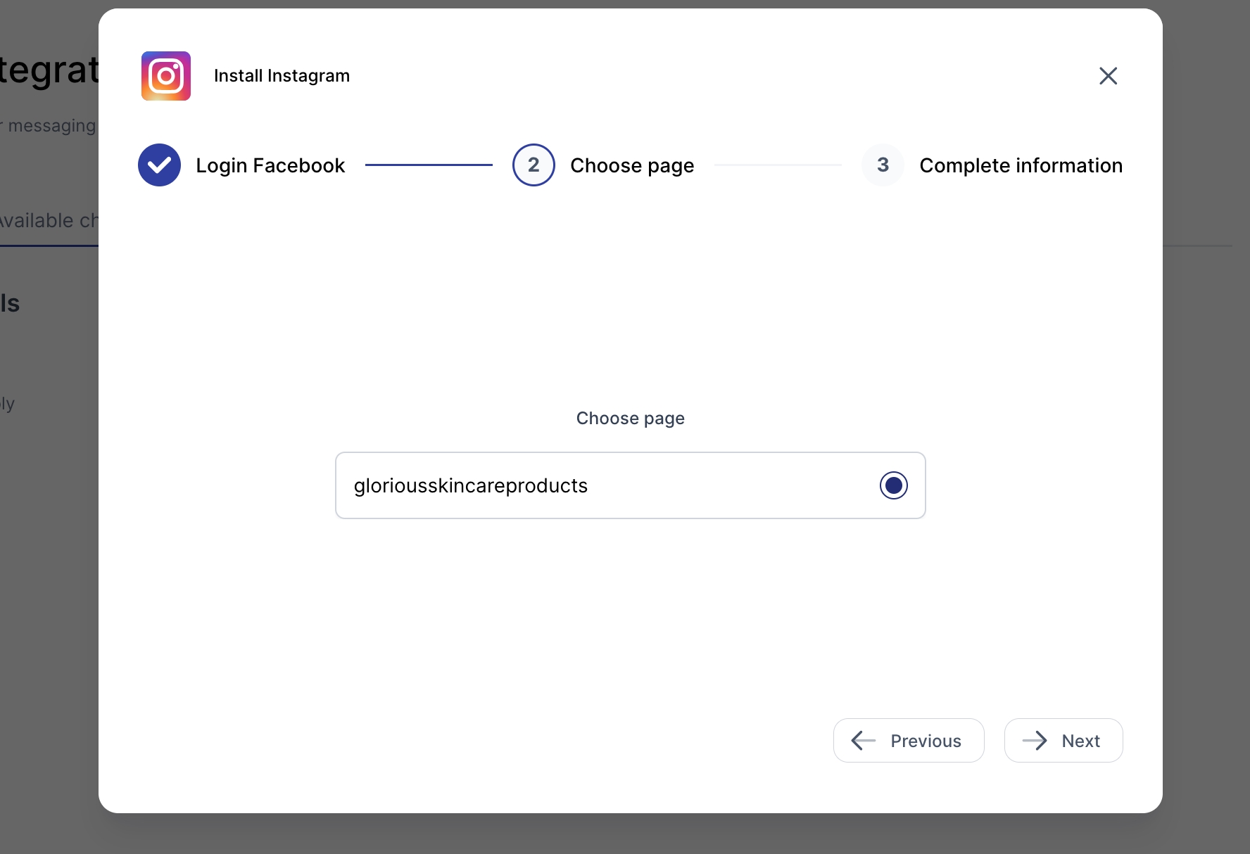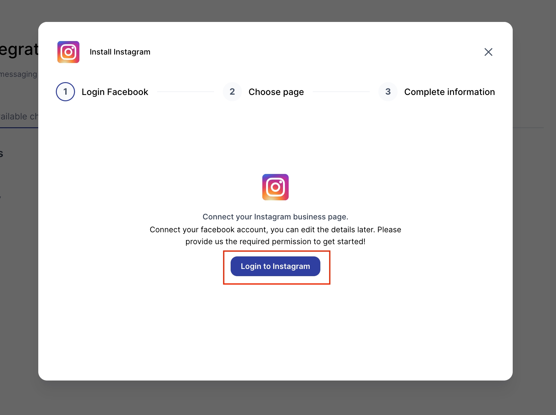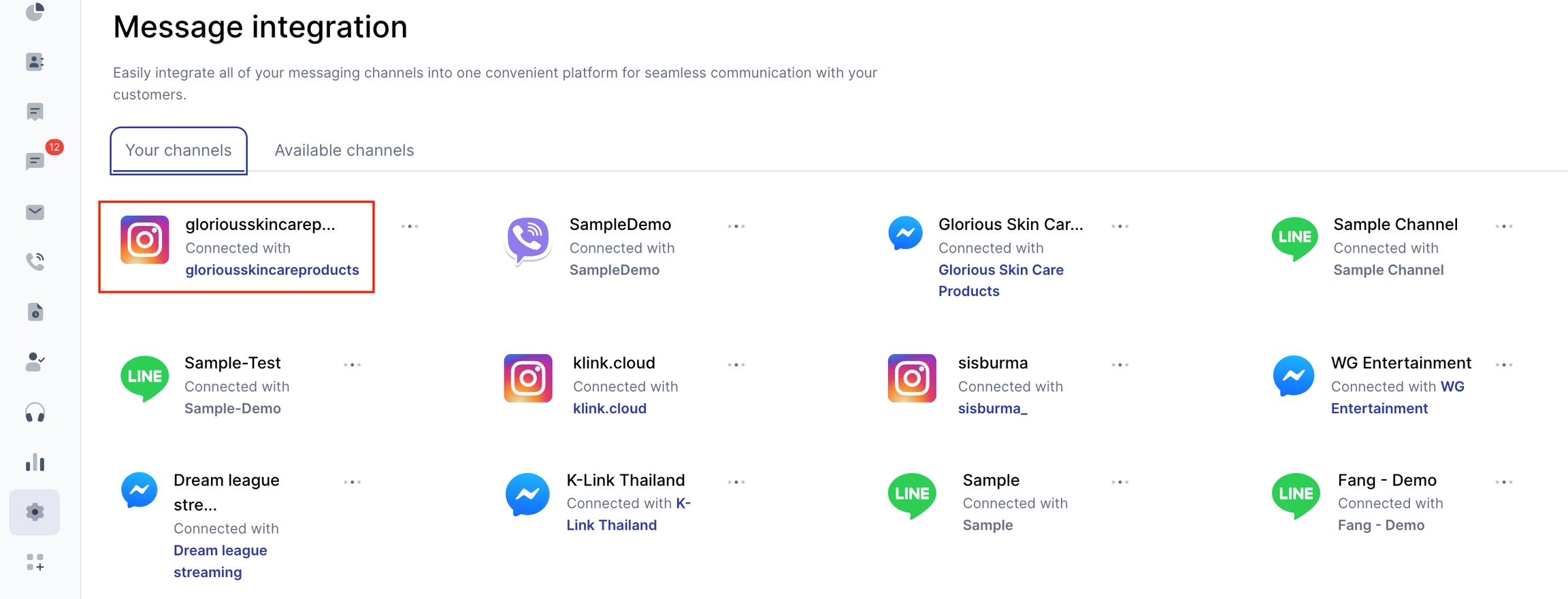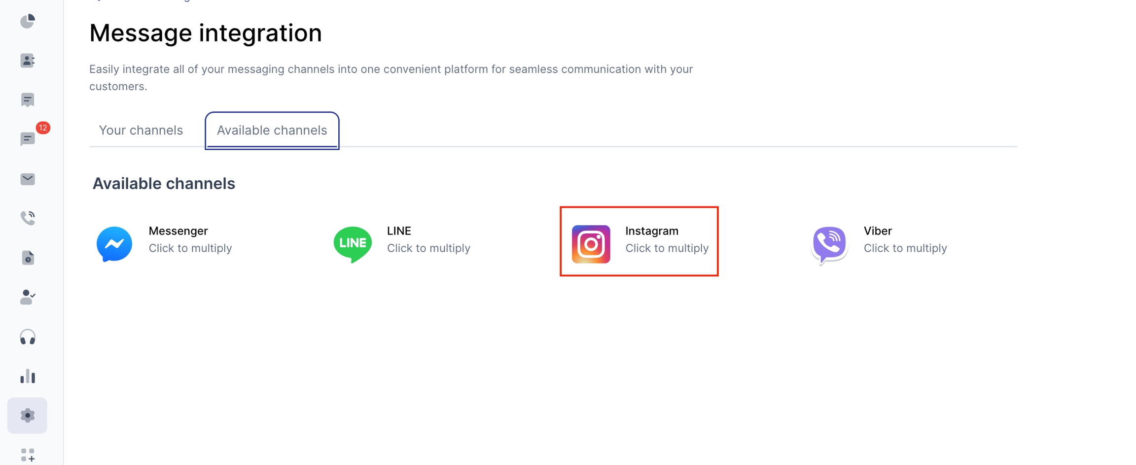 ไปที่การตั้งค่า > การรวมข้อความ > ช่องทางที่ใช้ได้ จากนั้นคลิก "Instagram"