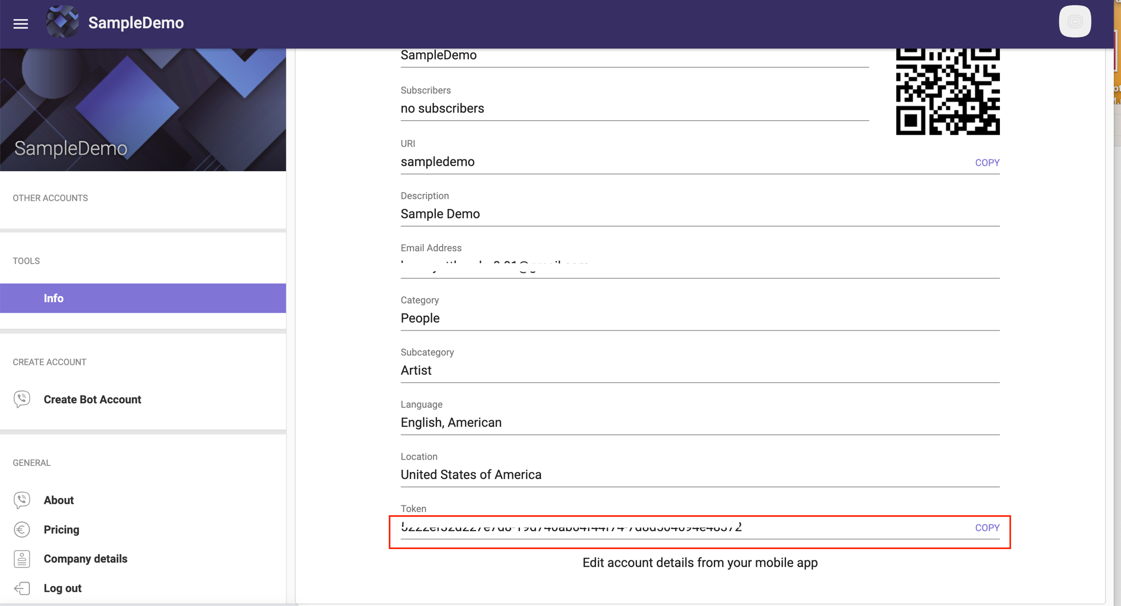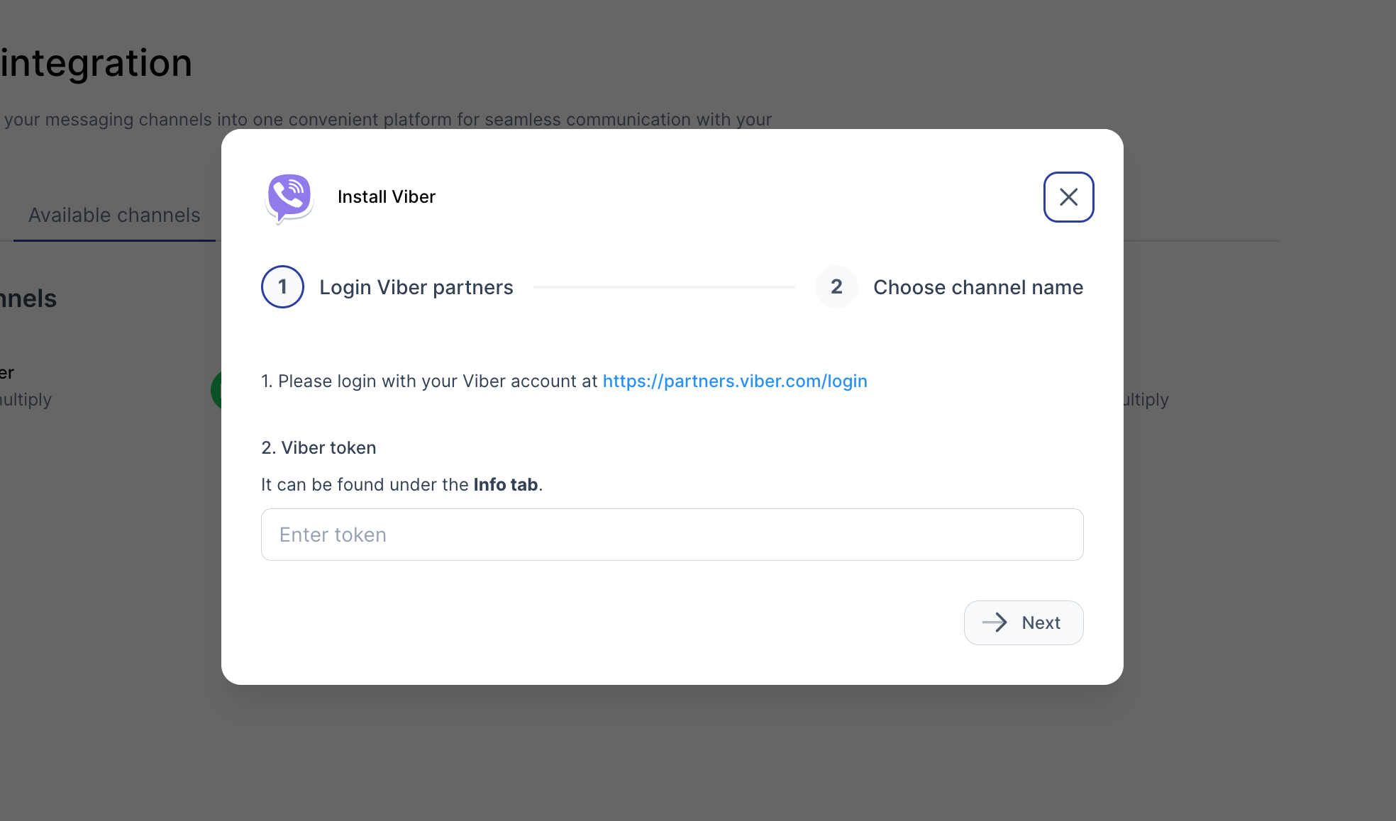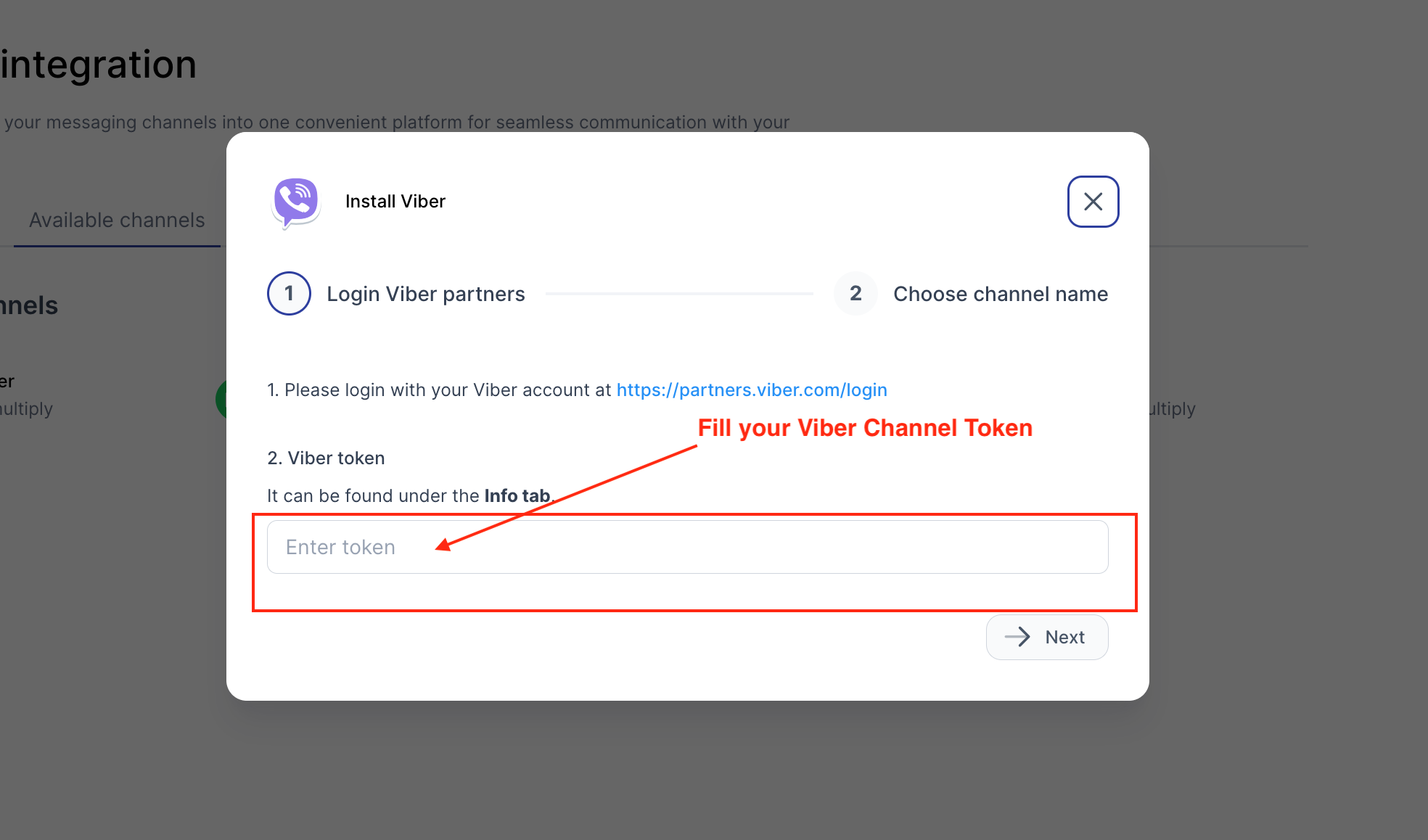 ขั้นตอนที่ 2 - ไปที่ Viber Partner จากนั้นคัดลอก "โทเค็น" จาก Viber Channel ของคุณ