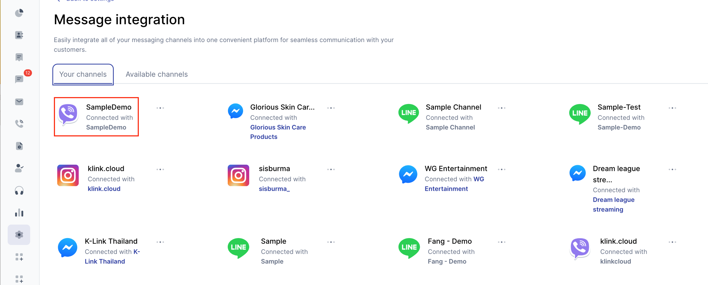 ขั้นตอนที่ 1 - ไปที่การตั้งค่า -> การรวมข้อความ -> ช่องทางที่ใช้ได้ คลิก "ไวเบอร์"